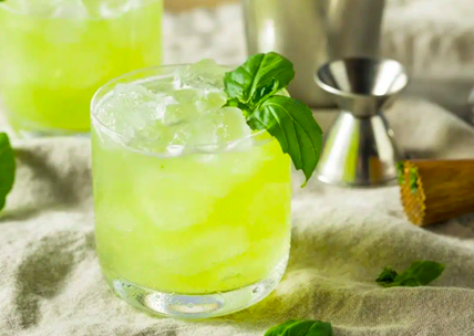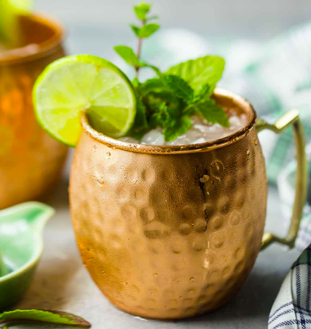 Servir dans une tasse cuivrée avec un quart de citron vert et de la glace pilée